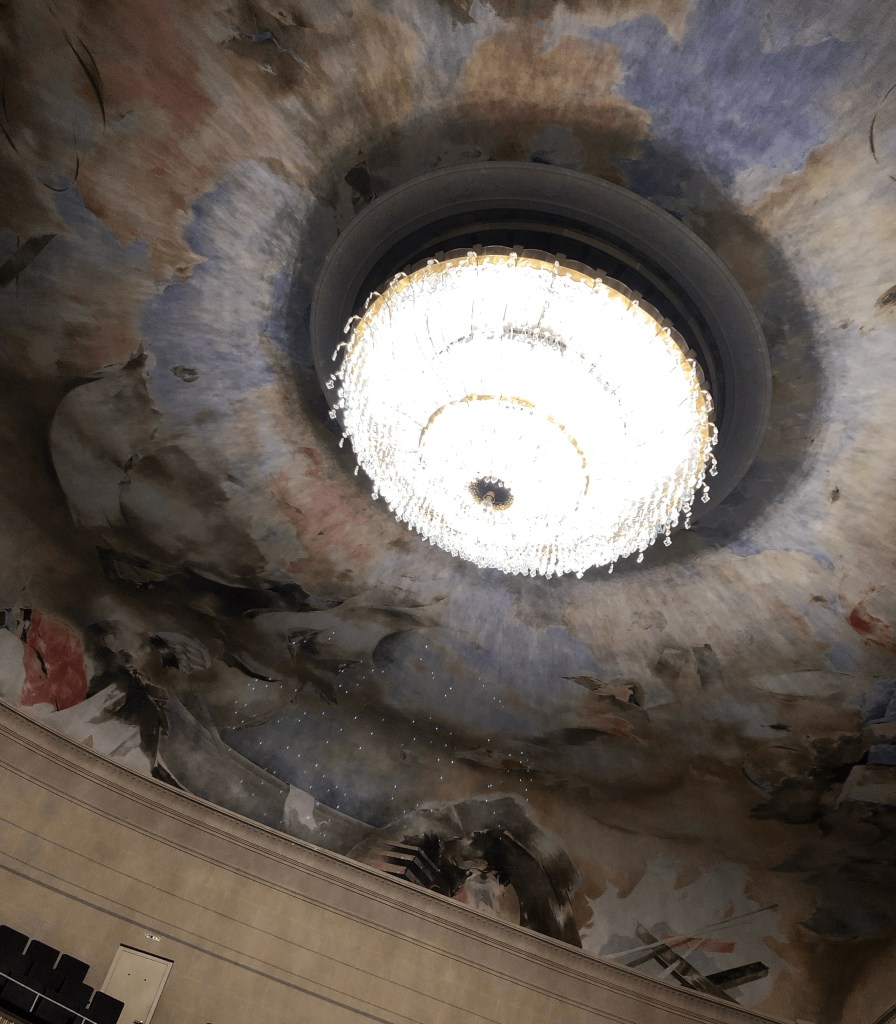 Der Kronleuchter im Großen Haus des Saarländischen Staatstheater in Saarbrücken (19. Mai 2023).