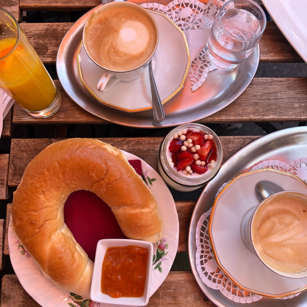 Viel zu schnell sind die Tage in Wien vergangen. Schon sitzen Anne und ich beim letzten Frühstück im Ignaz & Rosalia auf dem Meidlinger Markt. Zum versüßen des Abschieds mürbes Kipferl, feine Marillenmarmelade und eine Melange. Mit vielen Inspirationen, neuen Eindrücken und Begegnungen, ersten Ideen für den Horváth gehts mittags zurück ins Oberbayerische. Mit Sicherheit wird diesmal eine Rückkehr nach Wien nicht lange auf sich warten lassen. Die Zugfahrt lesend in den Sechsunddreißig Stunden verbracht.