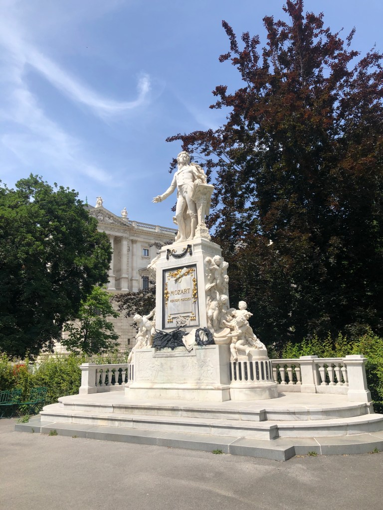 Impressionen aus Wien im Juni 2023. Bilder v.l.n.r. Mozart-Denkmal im Burggarten, Blick auf das österreichische Parlament, Kunsthistorisches Museum und Aufgang in die Albertina.