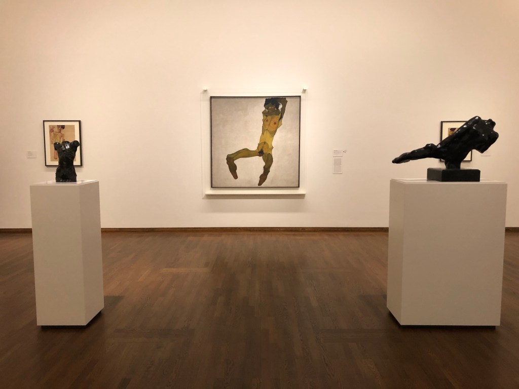 Einblick in einen Ausstellungsraum im Leopold Museum mit dem sitzenden Männerakt (Selbstdarstellung) von Egon Schiele, 1910.