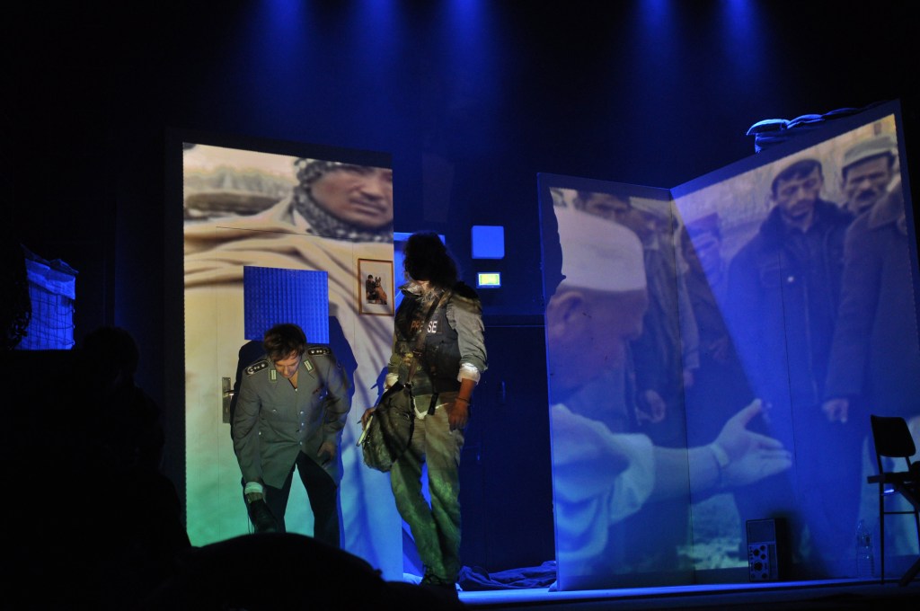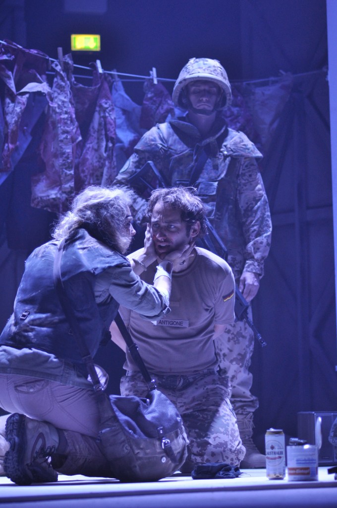 „In der Antigone-Inszenierung des Jungen Schauspiel Ensembles München sind die Protagonisten traumatisierte Bundeswehrsoldaten. Der ungewöhnliche Ansatz gelingt. (…) Die Inszenierung von Antigone im Kleinen Theater Haar beginnt mit einem unverblümten Angriff auf Nerven und Sinne des Publikums. Regisseur Michael Stacheder hat den antiken Dramenstoff des Sophokles aus dem vom Krieg gezeichneten antiken Theben in die Gegenwart verlegt. Die Produktion verknüpft den zeitlosen Konflikt zwischen Staatsräson und höheren, heiligen Gesetzen mit einer Thematik, die in Deutschland gewöhnlich keine Aufmerksamkeit genießt: Posttraumatische Belastungsstörung bei Soldaten. (..) Was an der Inszenierung besonders beeindruckt, ist neben dem Bühnenbild die mediale Nutzung wie die Bildzitate aus Mitschnitten über den Taliban-Angriff (…) ist die Inszenierung in jedem Fall ein intensives, spannendes Theatererlebnis mit albtraumhaften Elementen „Wäscheleine mit blutigen Uniformen), detailgetreu in der Ausstattung (Aylin Kaip), und nicht zuletzt eine Herausforderung für den Kopf.“