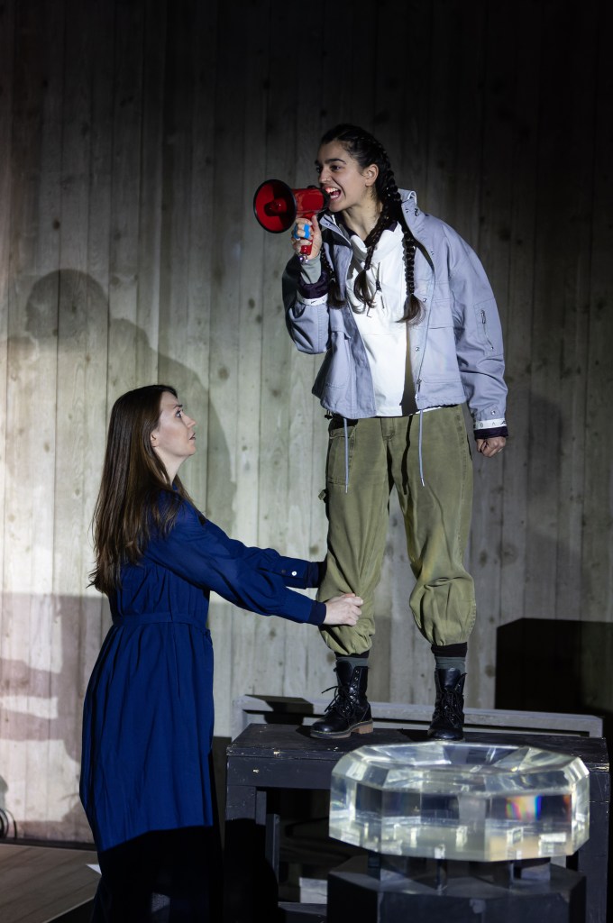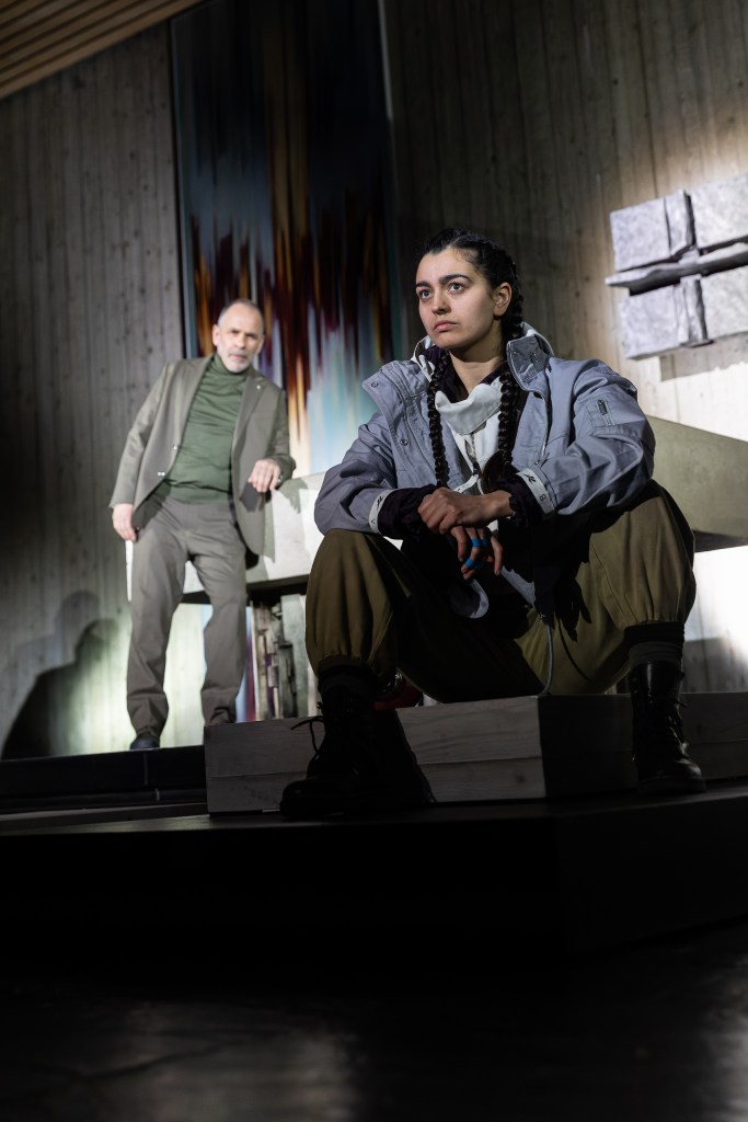 Martin Schwartengräber (Götz) am Altar lehnend und Melanie Sidhu (Nasty) davor sitzend.