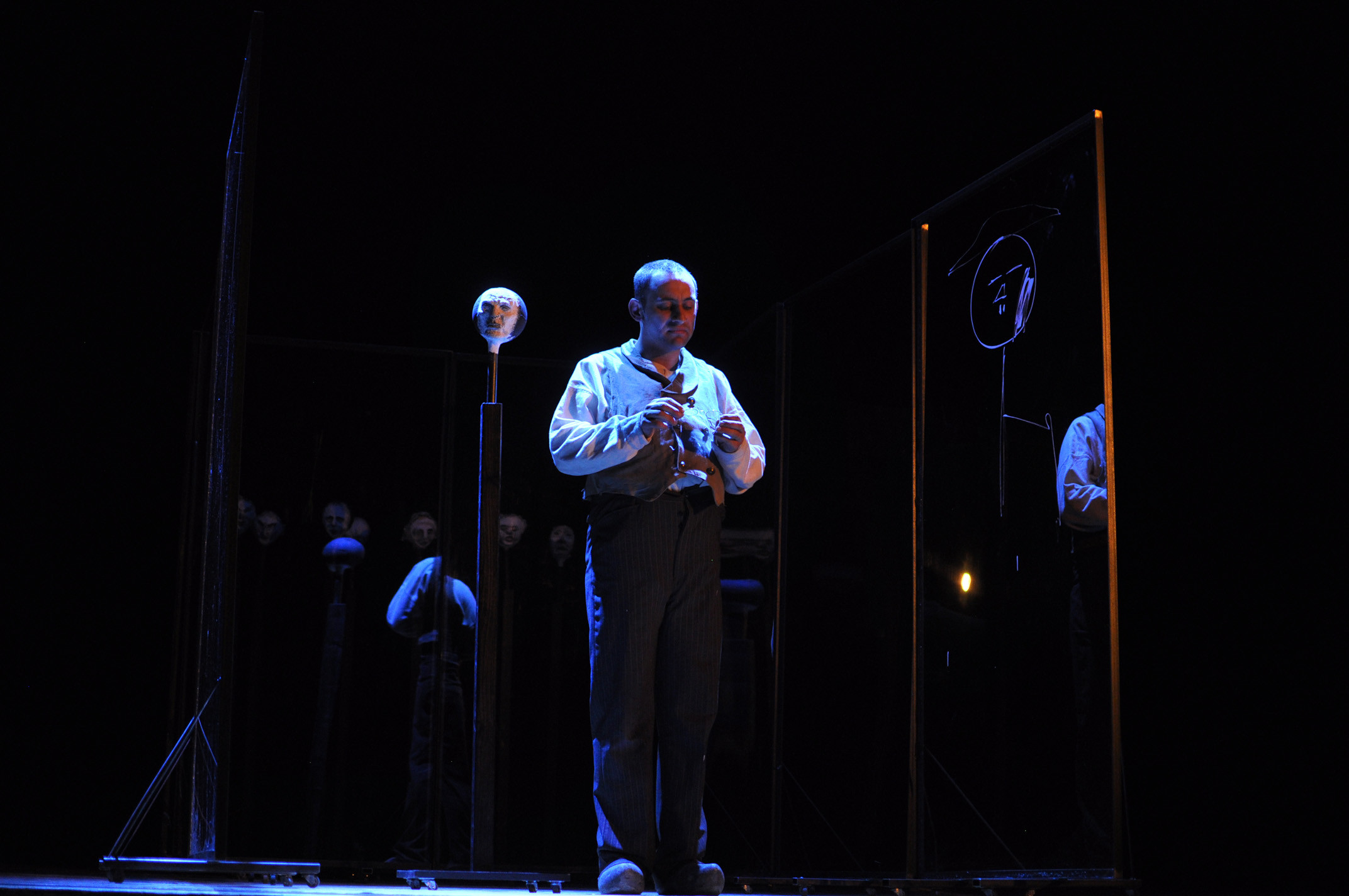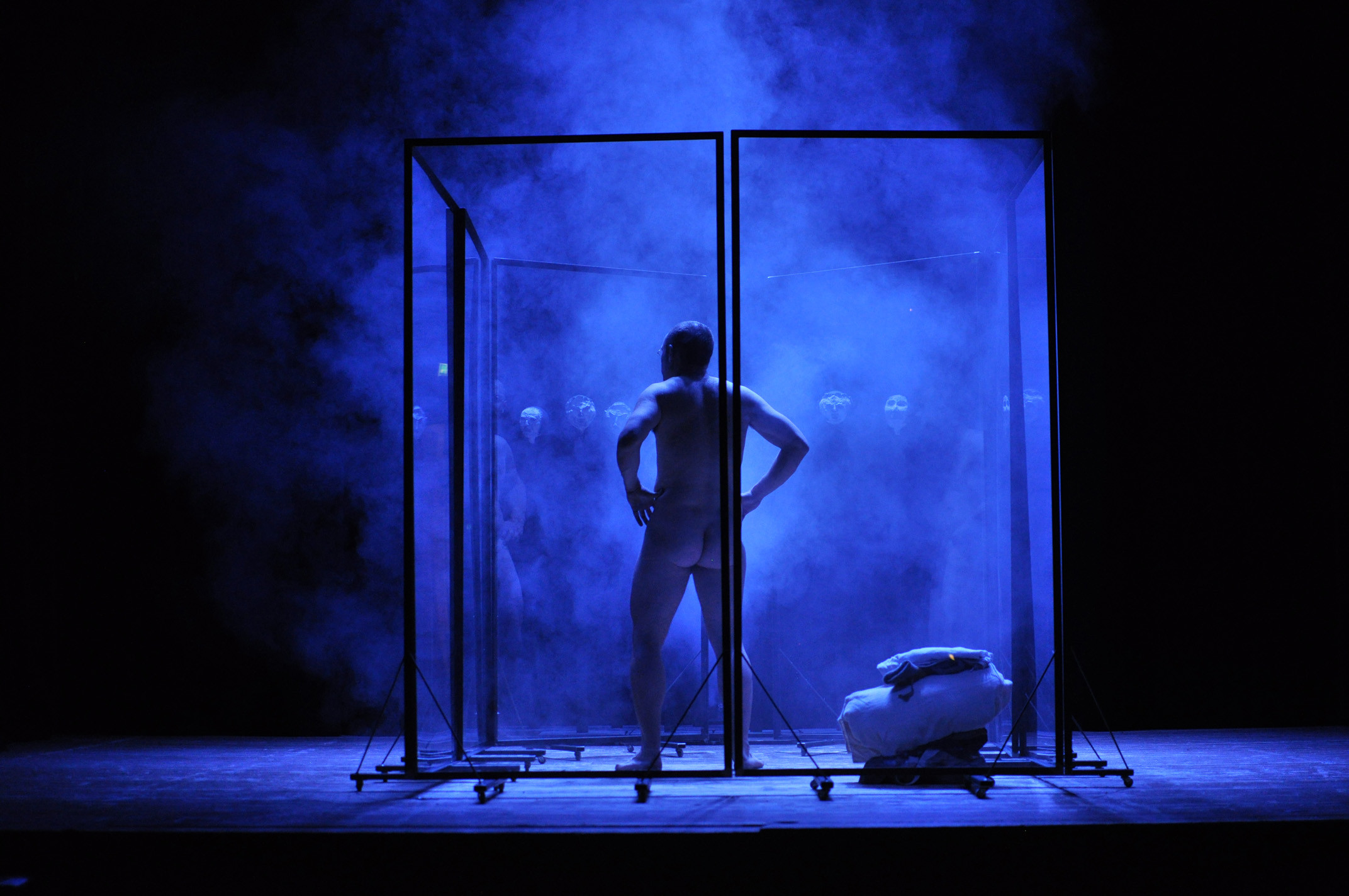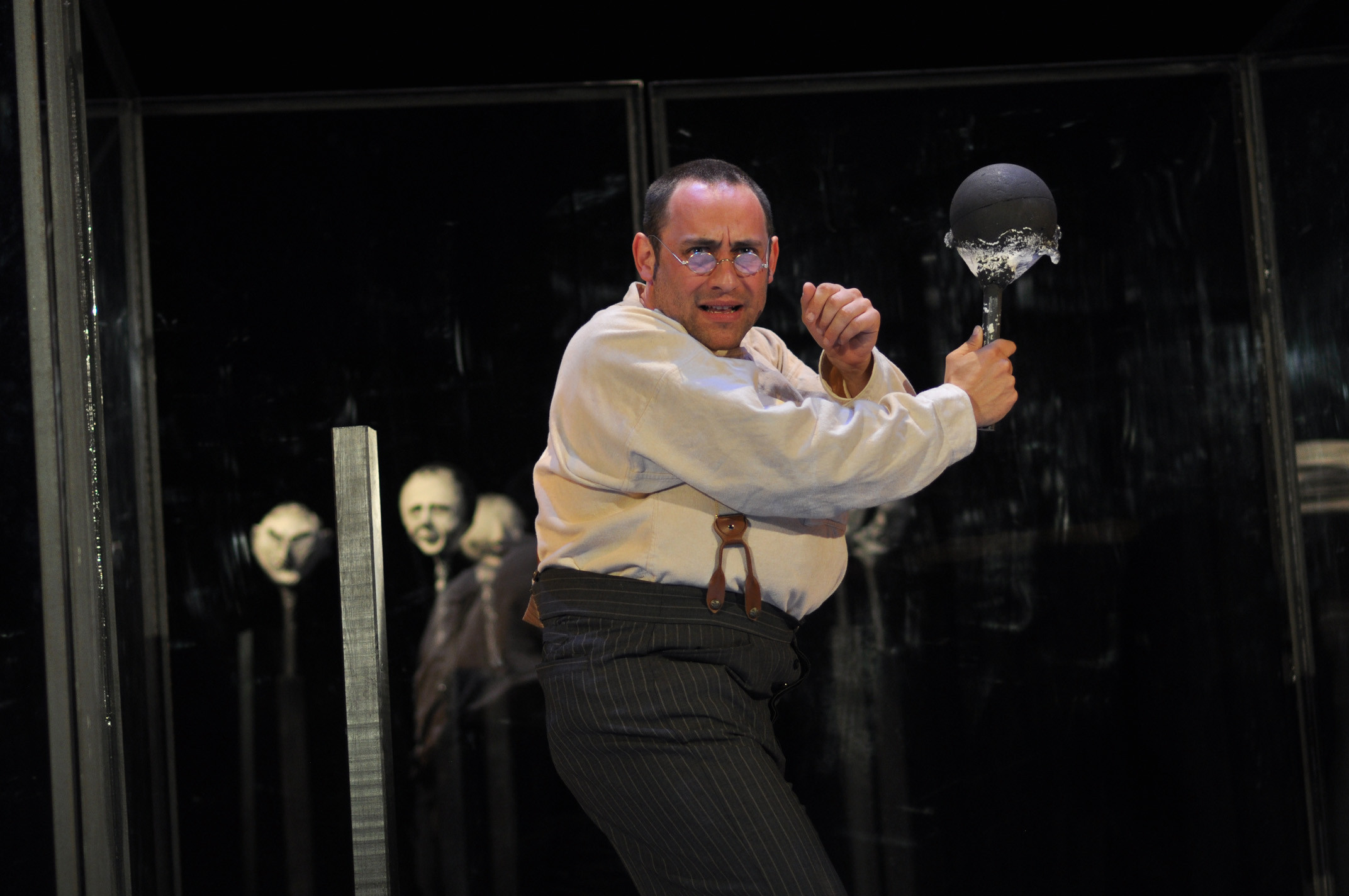 „Bühnenbildnerin Aylin Kaip drückt diese Ausweglosigkeit durch mehrere Plexiglaswände aus, die sich mal zum Labyrinth fügen, mal eine unsichtbare Grenze zwischen den Dorfbewohnern formen oder Schmeinta als Projektionsfläche seiner kindlich gezeichneten, kindlich-heilen Weltsicht dienen. Am Schluss aber formen die Wände eine enge Gefängniszelle, in die schon das Gas strömt und Dominikus ohne allen Argwohn seinen Tod erwartet.“