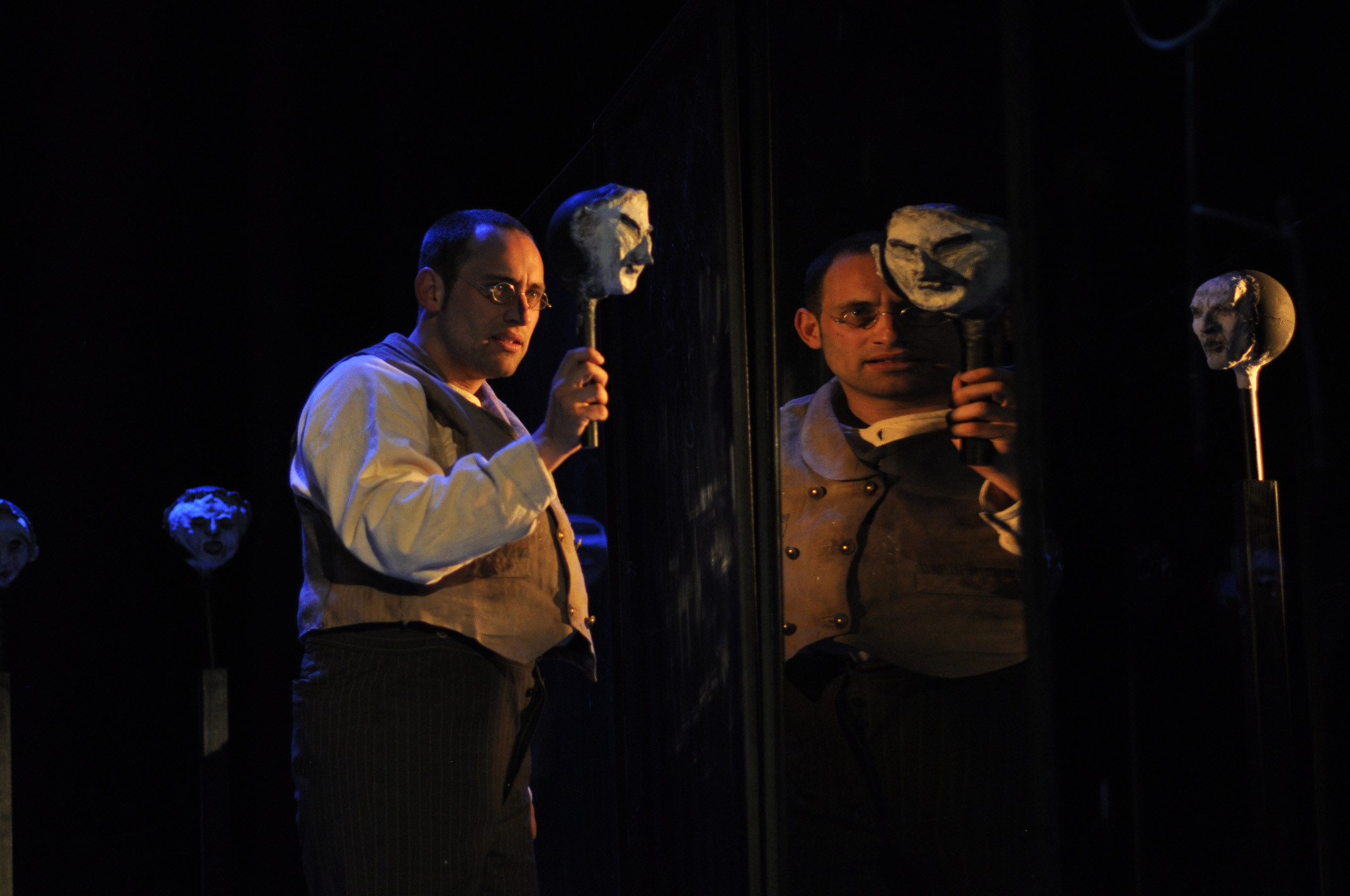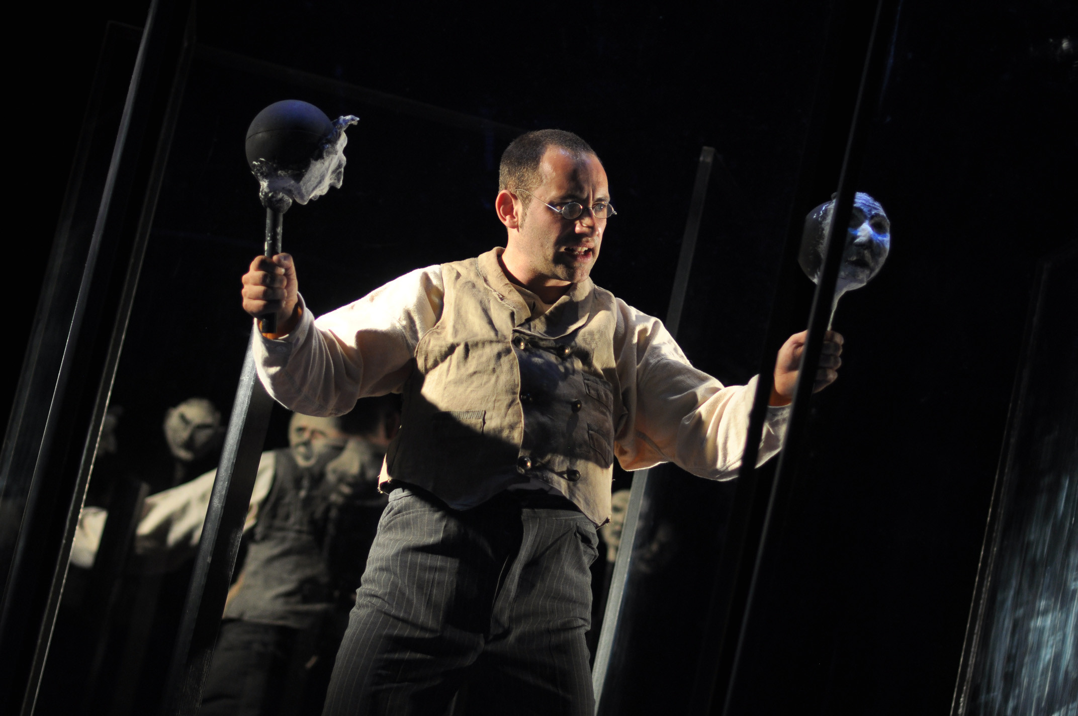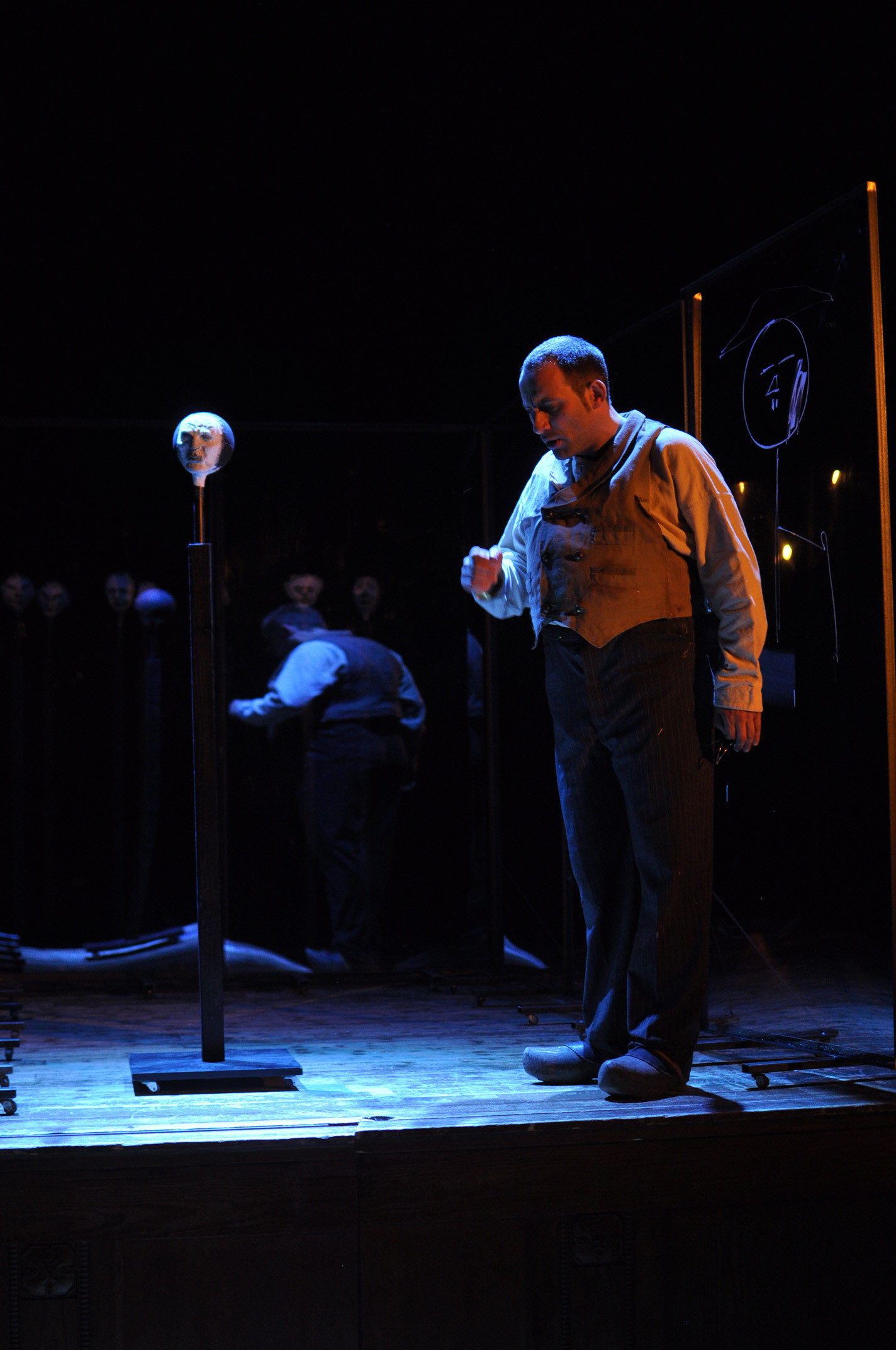 „Bühnenbildnerin Aylin Kaip drückt diese Ausweglosigkeit durch mehrere Plexiglaswände aus, die sich mal zum Labyrinth fügen, mal eine unsichtbare Grenze zwischen den Dorfbewohnern formen oder Schmeinta als Projektionsfläche seiner kindlich gezeichneten, kindlich-heilen Weltsicht dienen. Am Schluss aber formen die Wände eine enge Gefängniszelle, in die schon das Gas strömt und Dominikus ohne allen Argwohn seinen Tod erwartet.“